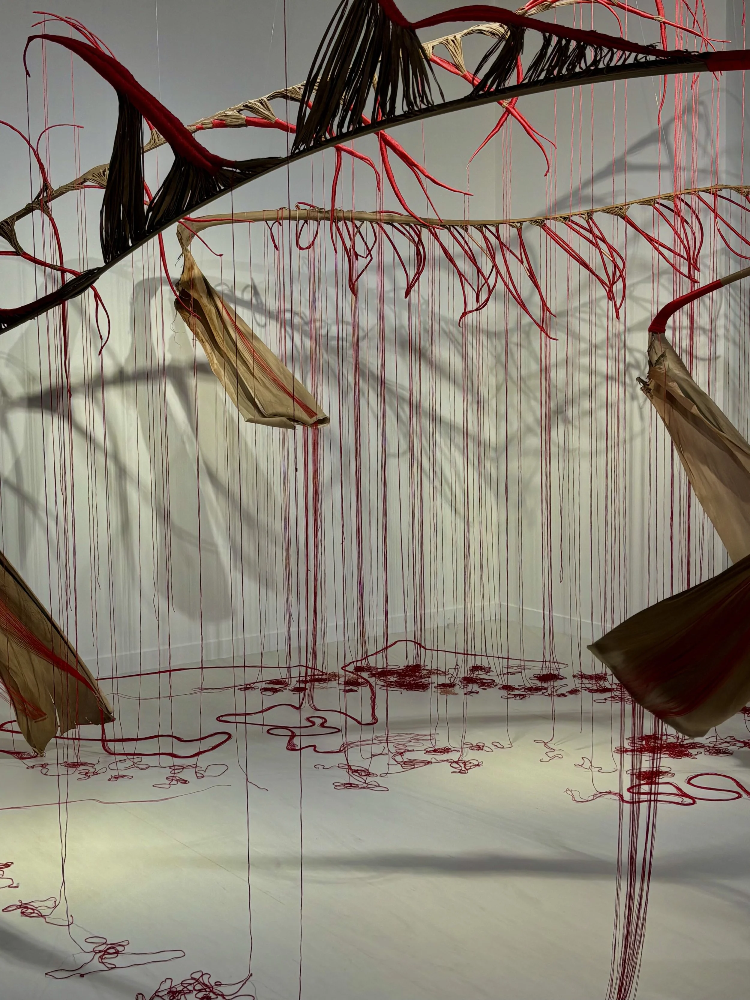 The dominance of figuration and traditional media—especially weaving and craft-based practices (notably El Anatsui at October Gallery and Olga de Amaral at Lisson Gallery)—can be read as a form of aesthetic risk reduction. In a market still in formation, the tactile, the familiar, and the iconographically legible appear to circulate more smoothly than conceptually or institutionally demanding positions. This preference suggests a market seeking stabilization, relying on forms that offer immediate cultural readability. Standout works like Lynda Benglis’s multi-part sculpture Elephant Necklace Circle (2016) at Pace Gallery and Shirin Neshat at Lia Rumma further exemplified this blend, drawing on global influences while resonating locally.
